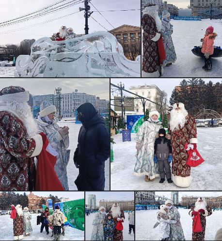 "Новогодний марафон" от "Центра Народной Культуры и Досуга" п. Берëзовка. Дедушка мороз со Снегурочкой гуляли по площади Ленина нашего прекрасного города и вручали сладкие презенты детям и взрослым за стишки В это время, на сцене ледового катка, пели и плясали наши звëздочки из театра детской песни "Зазеркалье" |